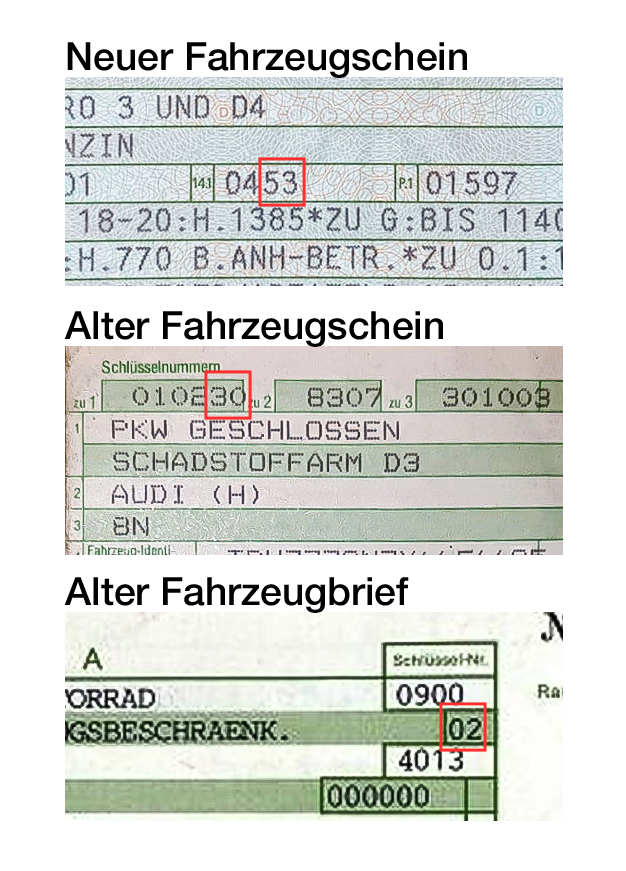 - Alter Fahrzeugschein: Feld „Schlüsselnummer – zu 1“